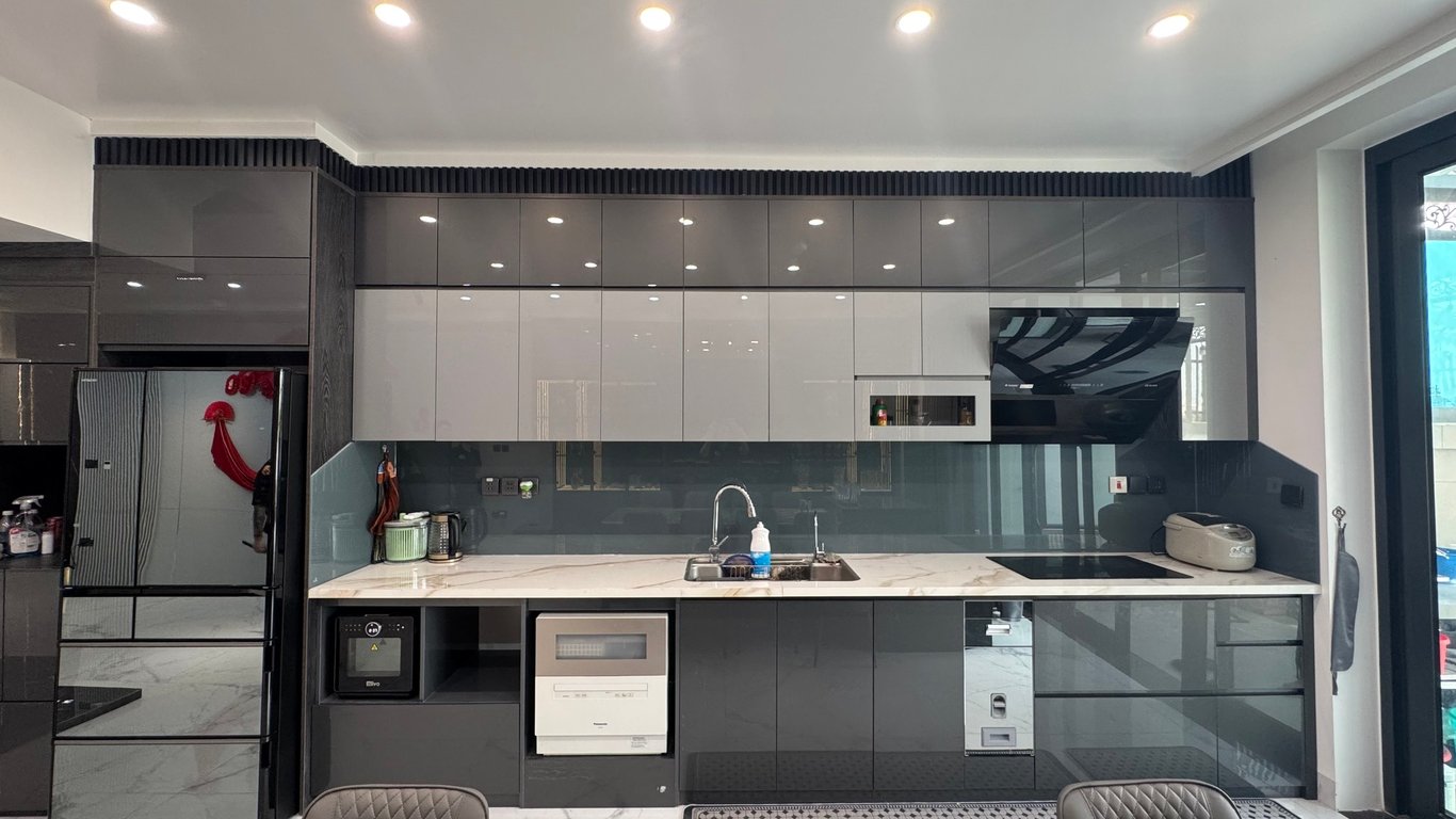 Alto Clean là mẫu tủ bếp chữ L với thiết kế tinh gọn, hiện đại, phù hợp với đa dạng không gian từ căn hộ nhỏ đến nhà phố. Tủ sử dụng cốt MDF lõi xanh chống ẩm, phủ acrylic bóng gương giúp dễ lau chùi và tạo cảm giác không gian sáng hơn. Hệ phụ kiện ray giảm chấn, bản lề êm ái, chia khoang tiện dụng cho nồi, chảo, gia vị và máy hút mùi.
